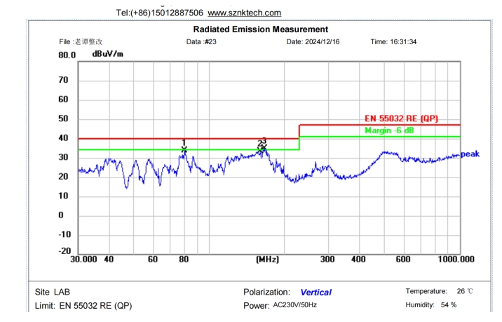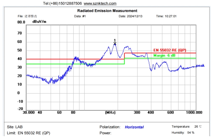整改前:輻射發射值在30MHz至1GHz頻段內最高超出標準限值10個多dB。
