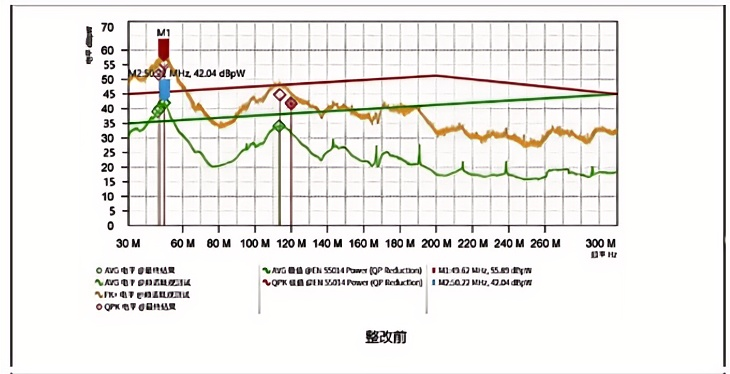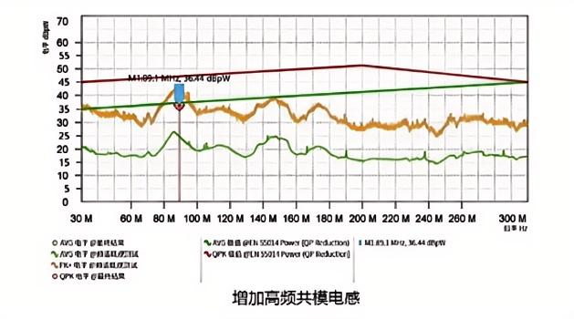 為讓電機達到十萬轉的高轉速,初始設置的載波頻率為40KHZ,相較于其他電機,頻率高了一倍。在這個情況下其他整改方法始終無法有效的改善EMC,將頻率降至30KHZ并且將MOS的開關次數降低1/3后才有明顯的改善。同時發現MOS的反向二極管的Trr(反向恢復時間)對EMC有影響,選用了更快反向恢復時間的MOS。測試數據如下圖,500KHZ~1MHZ余量增加了約3dB且尖峰波形有所平緩;因PCBA的特殊布局,在其中有兩根高壓的電源線需要與其他信號線捆綁在一起,將高壓線改為雙絞線后,引線之間的相互干擾小了很多;電機線串錳鋅共模電感,感量大約50mH,電感前后并1uF X電容,對500KHZ~2MHZ區間內的EMC改善明顯,傳導測試pass。電機線再串鎳鋅共模電感,感量約為60uH,對30MHZ~50MHZ區間內的EMC改善明顯,功率騷擾pass。