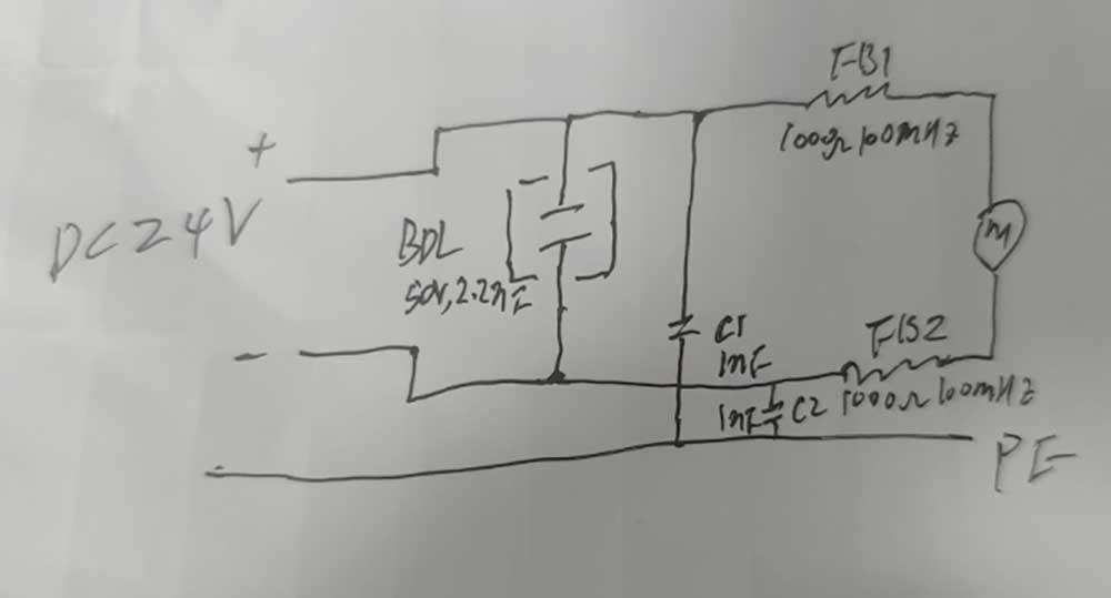 如圖,首先在電機正負機串1000歐100MHz的磁珠,正負分別對地1nF,耐壓1kv插件陶瓷電容,最后在正負間并BDL三端濾波電容(2.2nF,50V耐壓)